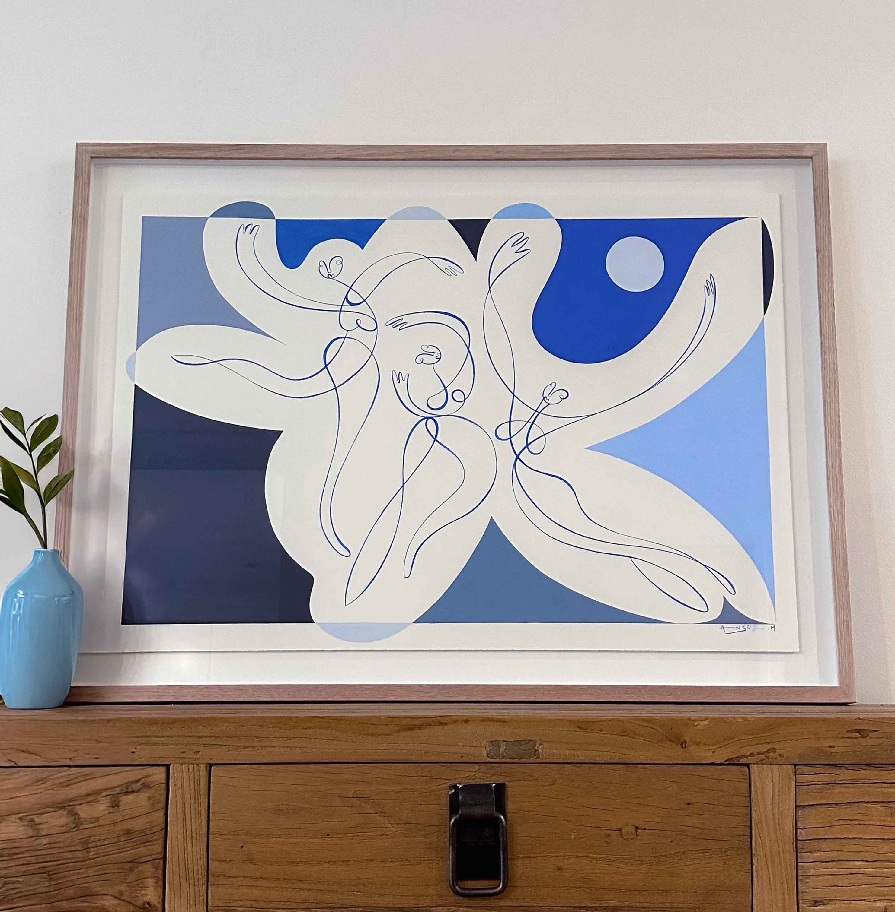 The flow of the figures bodies symbolizes release, healing, and joy emerging from the depths of emotion. In each step, the blues dissolve, making way for light, freedom, and the soul’s renewal.